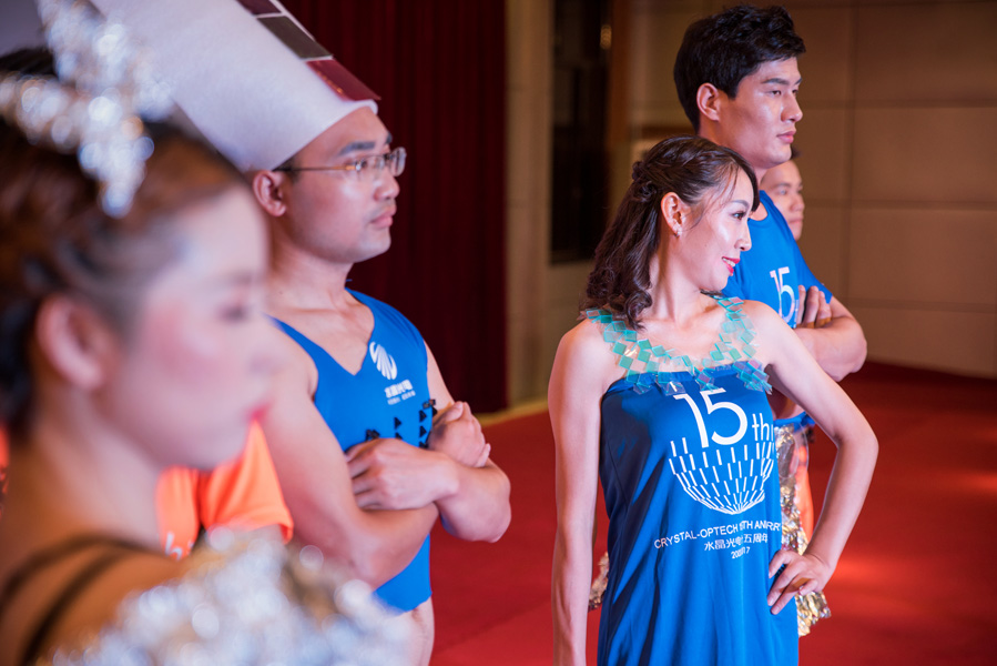 注:今年是水晶光电成立15周年,水晶人的身上穿着15周年司庆的旗帜做的各种款式的衣物,衣服上还贴有水晶光电的主要产品之一——光学低通滤波片和各种蓝宝石构成的组立件。