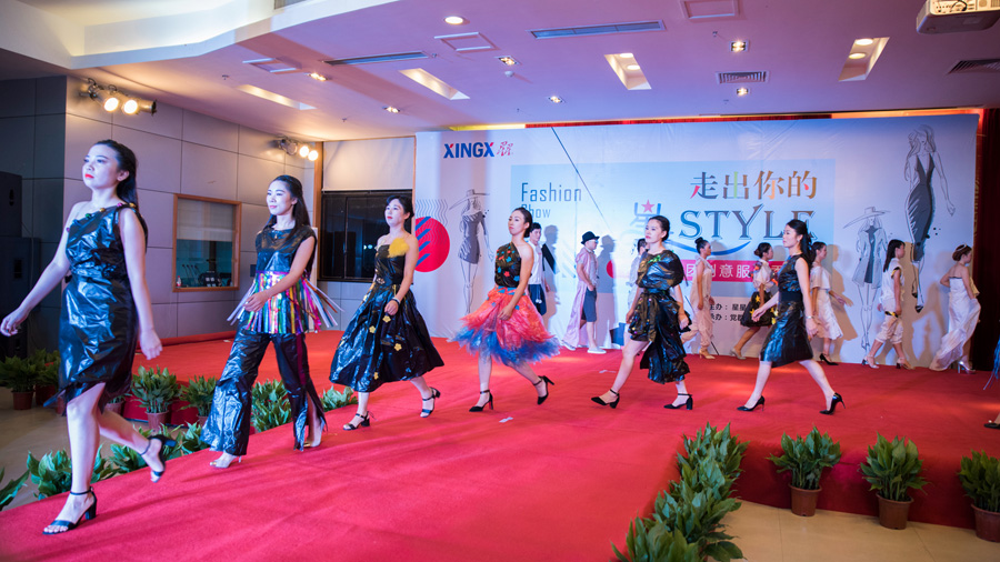 注:鸿运国际科技队身着带有其主要产品之一的手机视窗防护屏的各式衣服出现在舞台上,她们的产品在她们的身上完美地呈现着……